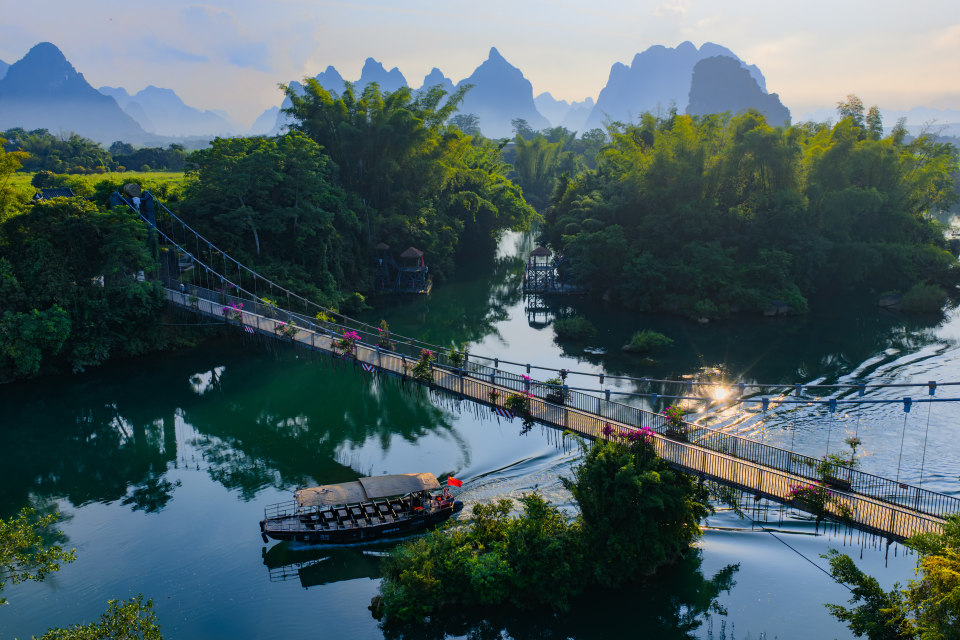 峒那屿湾景区地处喀斯特地貌核心区,素有“七岛七湾千礁屿,两河两岸万重山”之美誉,集山水灵秀与人文底蕴于一体,2017年被评为国家4A级旅游景区,2019年入选国家湿地公园。景区以“峒那”喻指山间良田与人家,“屿湾”象征星罗棋布的水域景观,生动诠释了人与自然和谐共生的壮乡生活图景。
