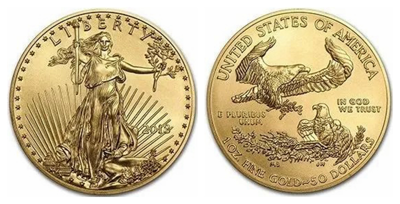 美国鹰洋金币:正面自由女神像的造型会随年份调整细节,背面图案有单头、双头、飞翔鹰造型不定期变化。