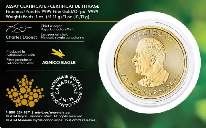 2024版加拿大枫叶金币首次采用了“查尔斯国王头像”,这是自发行以来首次更替金币上的君主形象,记录着王权更迭。