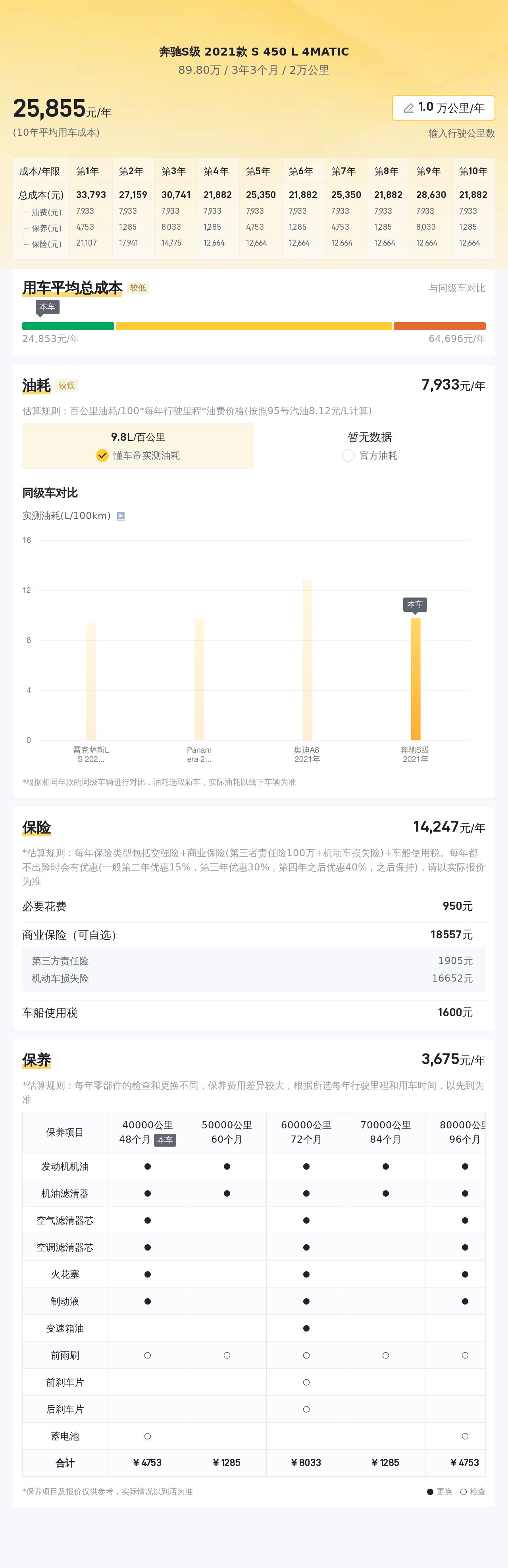 在选购二手车时,我们不仅要考虑购车成本,还要估算一下日常使用和保养的费用。根据估算,在合理用车的情况下,这辆车的年均综合用车成本大约在2.6万元左右。当然,这个数字还会随着您的用车习惯和维护情况而有所变动。