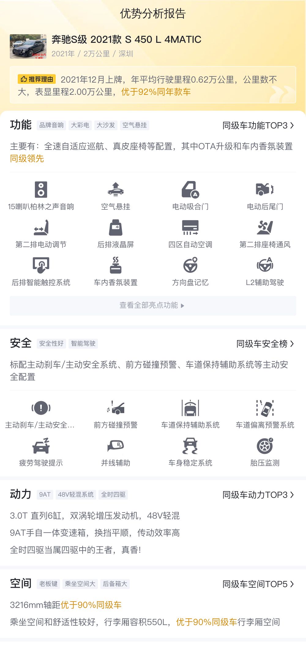 今天我们要看的这辆奔驰S级2021款S 450 L 4MATIC,上牌地为广东深圳,上牌日期2021年12月,表显里程2万公里,新车指导价125.88万,卖家报价89.8万,车身颜色黑色,过户次数1。
