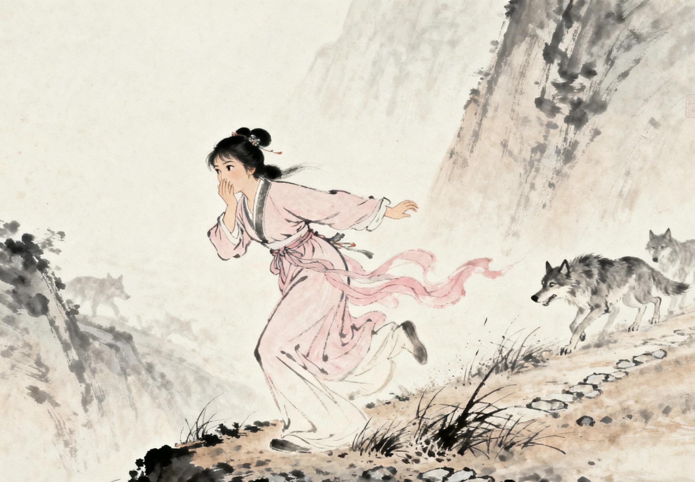 春桃吓得腿软,想喊春杏,却发现四周空荡荡的,春杏早没影了。她不知道,春杏刚才就看见狼了,一开始她也慌,想喊姐姐跑,可转念一想 “要是狼吃了春桃,树根哥就是我的了”,她咬了咬牙,悄悄往后退,然后转身往山下跑,连脚步声都不敢放重。