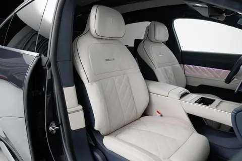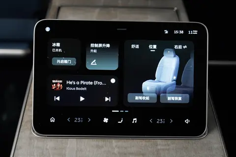 后排的仪式感和舒适度,全落在实用细节上,没搞虚浮设计。走近车辆时,底盘自动降低,车门平行抽屉式弹出,地面同步亮灯,上下车不用弯腰,穿西装或长裙也能保持优雅,仪式感拉满。车内用枫影真木装饰 + 传统刺绣元素,没有浮夸的金色堆砌,雅致中透着东方美学。后排飞航座椅支撑性极强,腿托、腰托可多角度调节还带按摩,长途坐两三个小时也不累。全车隔音到位,高速行驶基本听不到风噪、胎噪,旁有大货车经过也能隔绝噪音,搭配音响,休息或聊商务话题都不受扰。中间行政桥集成小冰箱、可折叠桌板与高速无线充电,办公、冰饮都方便,后排隐私玻璃可调节透光率,保障私密性,谈事、休息都安心。