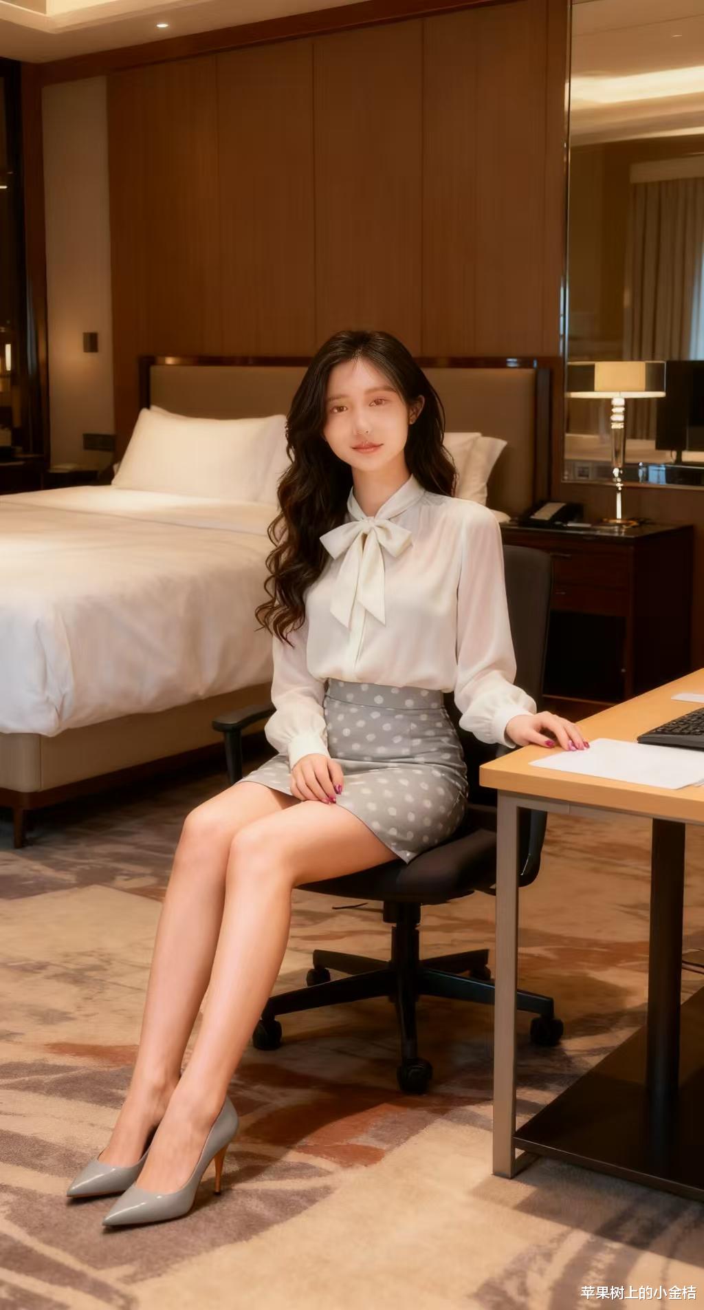 她穿了一件带飘带设计的白色长袖衬衫,领口的蝴蝶结增添了温柔感,搭配一条浅灰色底、带白色小波点的包臀半身裙,整体风格优雅又