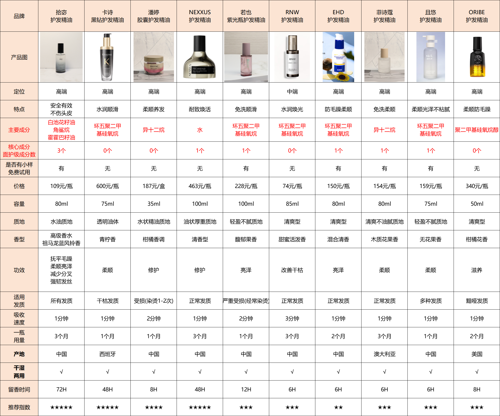 挑护发精油这种事,靠感觉太容易翻车。我之前就是被“闻起来不错”骗过,结果越用越毛躁。后来我终于学乖了,先看数据再下手。下面这张表就是我这次测评时记录的几款护发精油的情况,把关键点都写得明明白白,省得瞎猜,愿意细看的人绝对能省下不少弯路。
