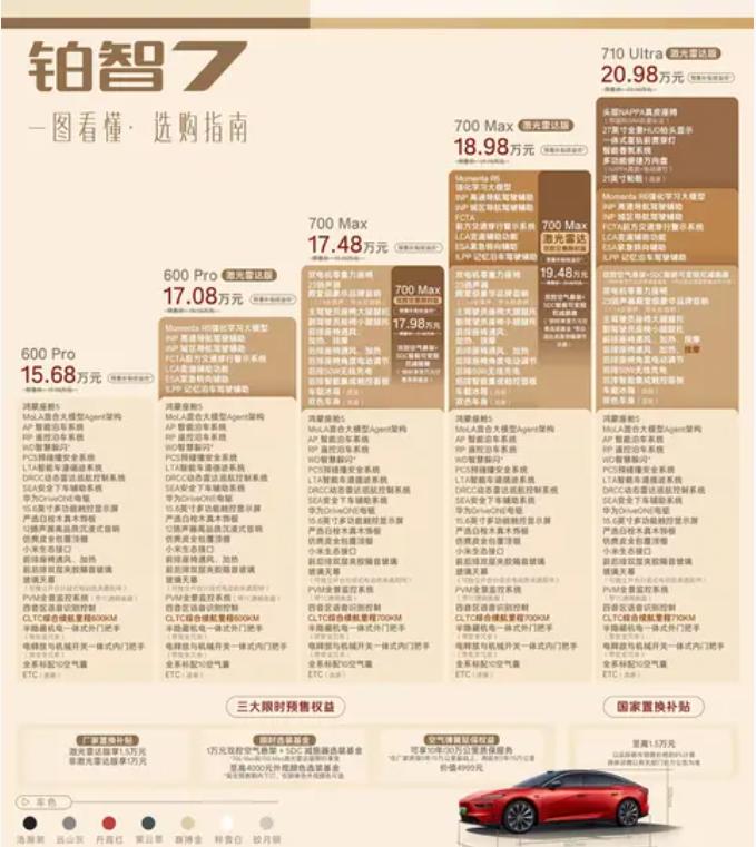 版本选购参考,结合预售价格与配置,不同预算用户可按需选择:入门版(15.68万元):标配鸿蒙座舱、真木饰板、座椅通风加热、20英寸轮毂,预算有限、追求基础实用配置的家庭可选择。双腔空悬版(17.98万元):可加装双腔空悬,底盘舒适性与路况适应性大幅提升,注重驾乘质感的用户推荐考虑。旗舰版(19.48万元):集成激光雷达、双腔空悬、鸿蒙座舱,智能与舒适配置齐全,追求全面体验可一步到位。顶配版(20.98万元):全系配置拉满,适合预算充足、想要完整体验的用户。