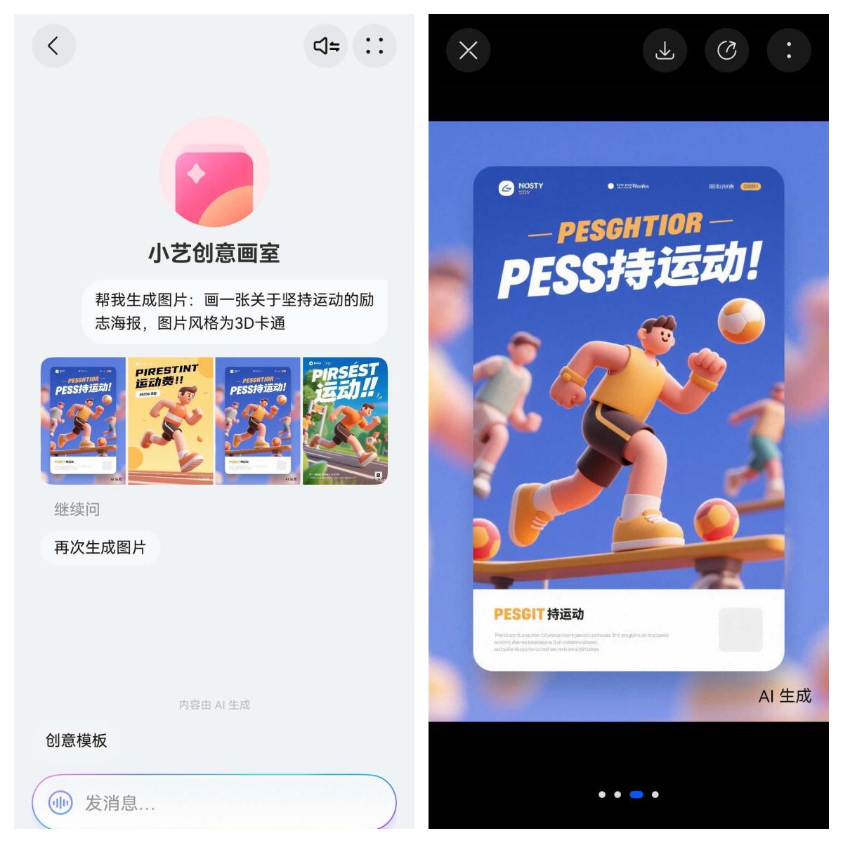 我打开升级到鸿蒙5后的华为Pura 70,在小艺App“发现”页智能体市场里找到小艺创意画室Agent,下达了充满正能量的指令:“画一张关于坚持运动的励志海报”。为了让画面看起来更有活力、不那么“说教”,我选择了动感的“3D卡通”风格。