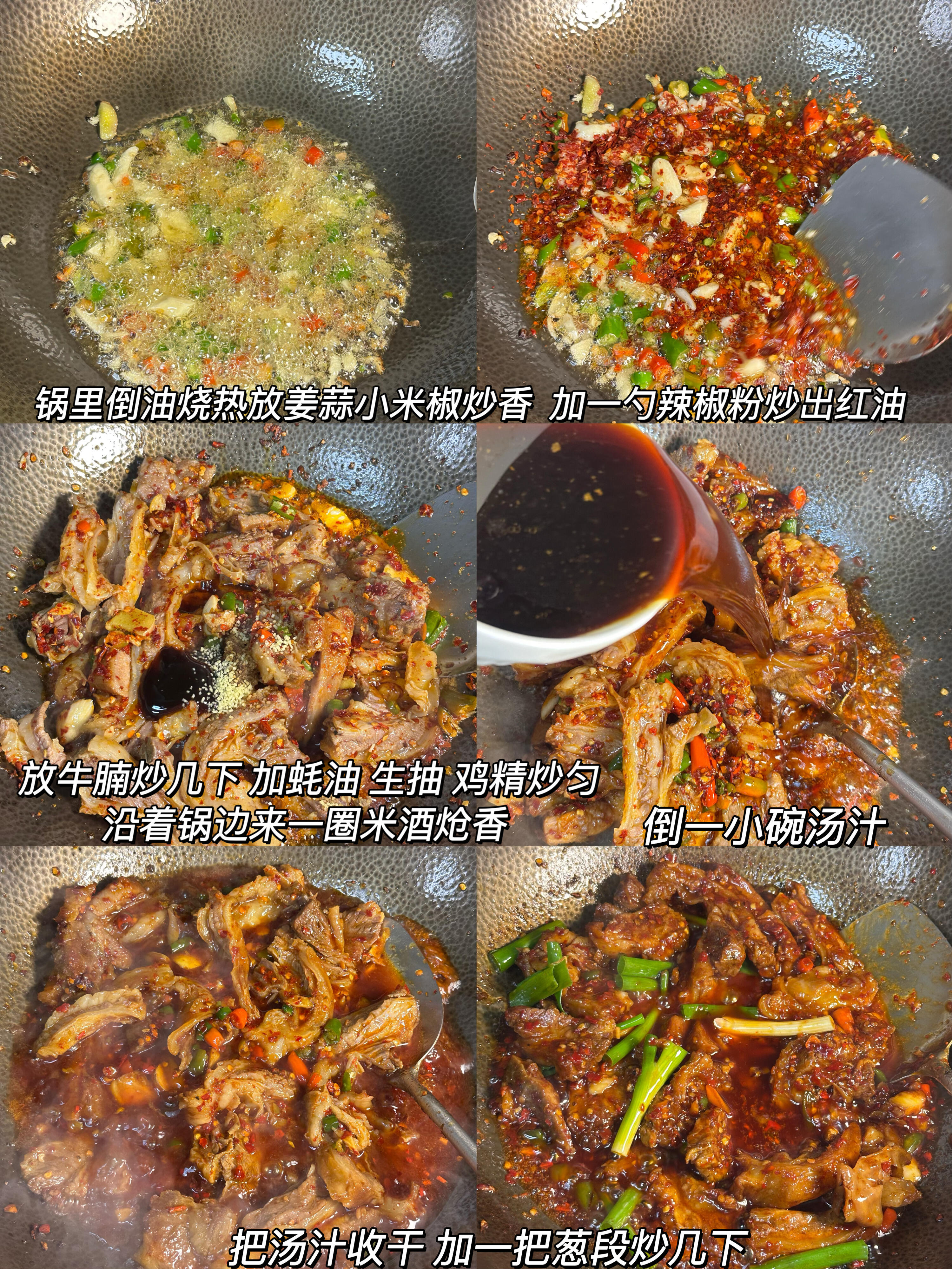 牛腩炖好了,接下来就是爆炒环节了。锅里倒点油,烧热后放入姜蒜末和小米椒段,炒出香味。然后,加入一勺辣椒粉,继续翻炒,直到炒出红油。这时候,把炖好的牛腩切成片,放进去翻炒几下,让牛腩都裹上红油。