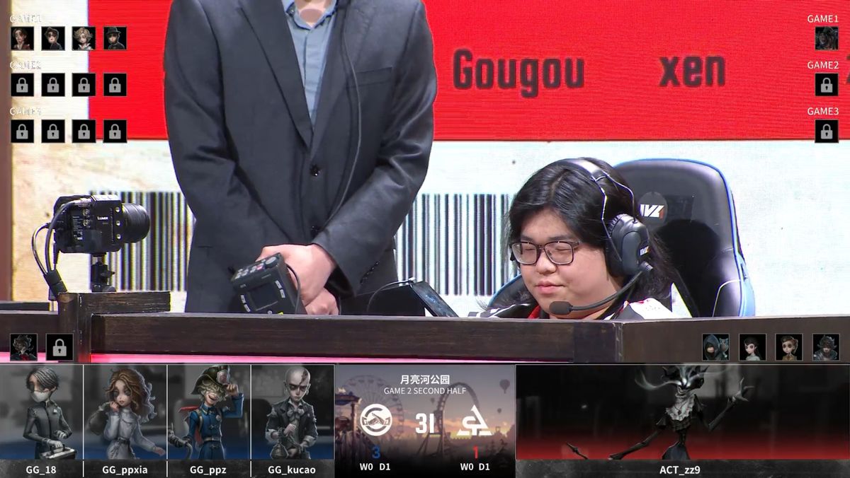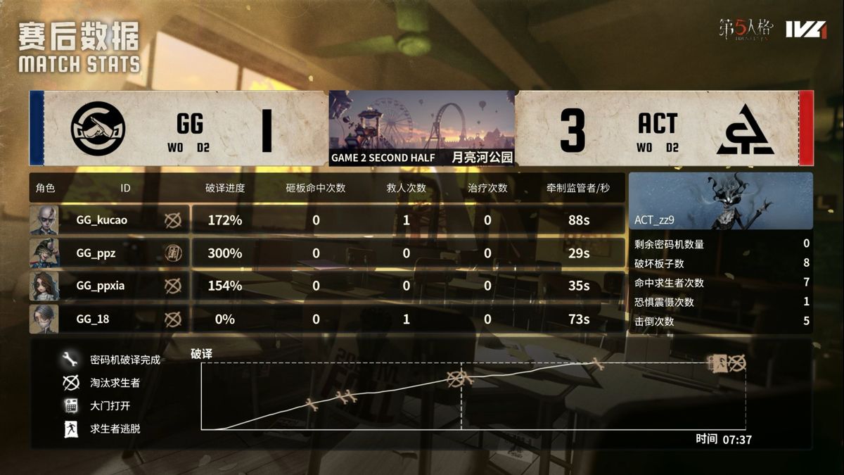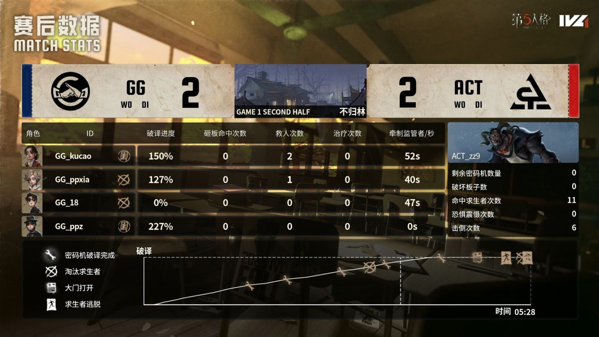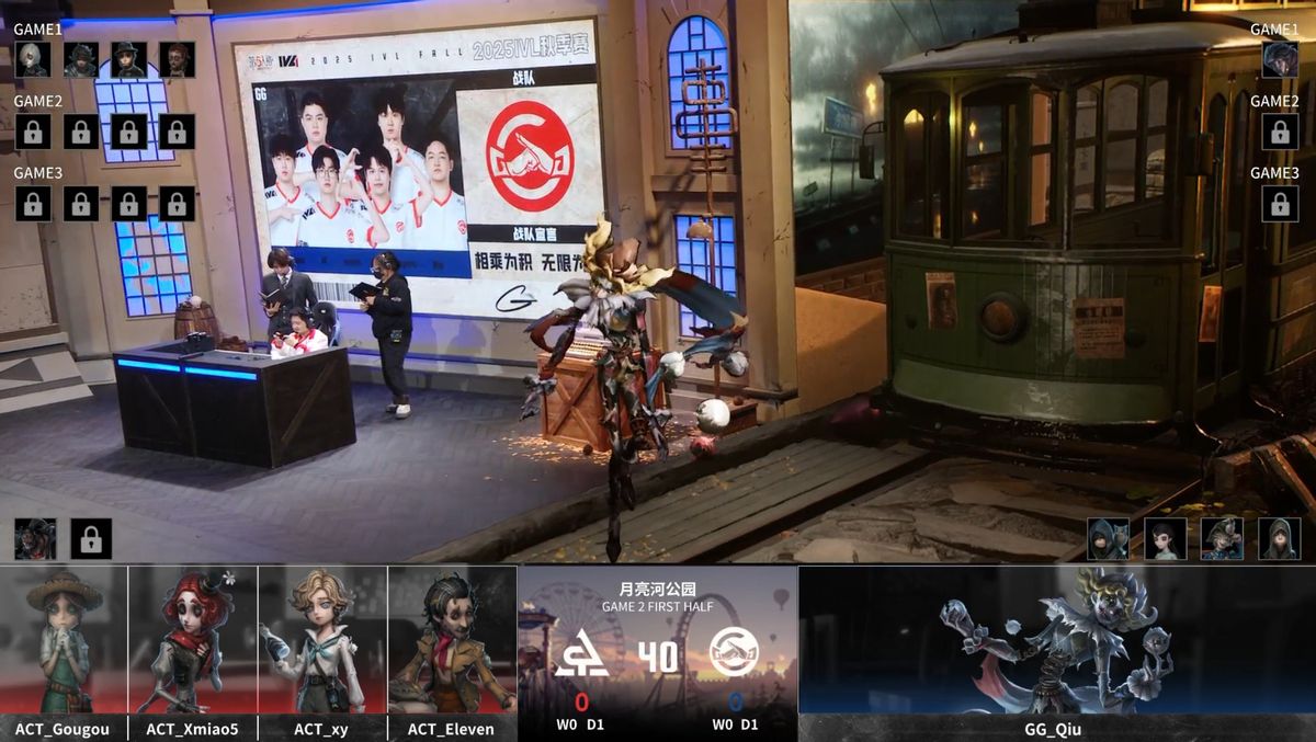 ACT的求生者选择了园丁、哭泣小丑、气象学家、野人(BAN“跛脚羊”);成都GG的监管者Qiu选择了“喧嚣”。(BAN先知、古董商、火灾调查员、佣兵)