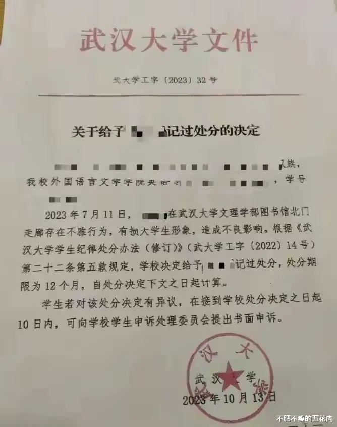 2023年10月13日,武汉大学干了一件“闪电战”——女生杨某某网帖控诉性骚扰才两天,校方就火速给男生肖某某扣上记过处分。通报写得那叫一个“艺术”:“存在不雅行为”——到底啥行为?不知道!为啥处分?懒得说!