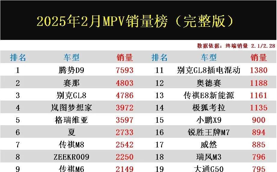 MPV,曾经是商务接待的专属座驾,如今却越来越走进普通家庭。二胎政策的放开、家庭出行需求的升级,都让MPV市场变得热闹非凡。但热闹背后,却是几家欢喜几家愁。2025年2月的MPV销量榜单,就像一面镜子,照出了这个市场的残酷现实。腾势D9以绝对优势领跑,而一些曾经风光无限的车型,却黯然失色,甚至濒临淘汰。这背后究竟隐藏着哪些秘密?MPV市场的未来又将走向何方?