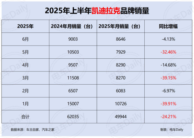 据统计,2025年1-6月,凯迪拉克累计销量49944台,同比下滑24.21%。从月度数据看,上半年仅1月销量突破万辆,2至6月连续5个月销量均未过万,其中最高月销量不足9000辆,这一表现与同级别的二线豪华品牌形成鲜明反差。