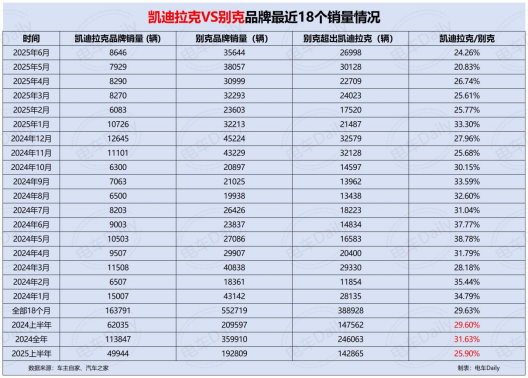 更严峻的是其在集团内部地位的下滑。2024年,凯迪拉克全年销量11.38万辆,虽与别克品牌的35.99万辆有差距,但仍能达到其31.6%的规模;而到2025年上半年,凯迪拉克销量仅为别克品牌的25.9%,凯迪拉克在整个上汽通用的销量占比持续萎缩。