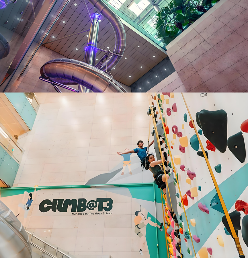 在互动体验方面,细节中体现关怀与温度。T3航站楼设有高达12米的免费滑梯、攀岩墙等趣味设施,帮助旅客放松心情,为旅途增添乐趣。连接各航站楼的Skytrain更像是一个观景平台,右侧座位让游客可以尽情拍摄列车穿越瀑布的壮丽画面。