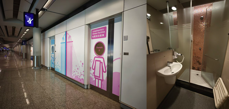 怀揣着不安的心情,笔者落地了香港机场,发现抵达层居然配备了淋浴室。一方面是好奇,一方面确实是刚需,笔者便毫不犹豫的体验了一把机场淋浴室,不仅免费使用,还提供吹风机、洗发水和沐浴露,同时还观察到有自动售货机可以购买毛巾和其他淋浴用品,在上一位用户出来后,保洁阿姨还会帮忙打扫干净再让下一位用户进去,体验感拉满。