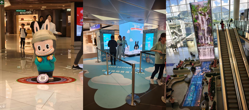 此外,机场内的艺术氛围也渲染的恰到好处。接机大厅设计了数字媒体艺术装置“瀑布庭园”,将大自然搬进机场,同时旅客可以触摸瀑布、鹅卵石、睡莲和小动物等数字形象进行互动;第一客运大楼和卫星航厦之间建起了一座200米长28米高的天桥,供旅客270度俯瞰机场全景和拍照打卡;联合当下最火的IP拉布布,在机场的中庭、商店前设置艺术装置,并与商户联动,在机场内任意消费,凭当日收据参与限量版Labubu手办或其他周边奖品抽奖;机场内分布着其他各类艺术装置,连就餐区域也都做了艺术设计。