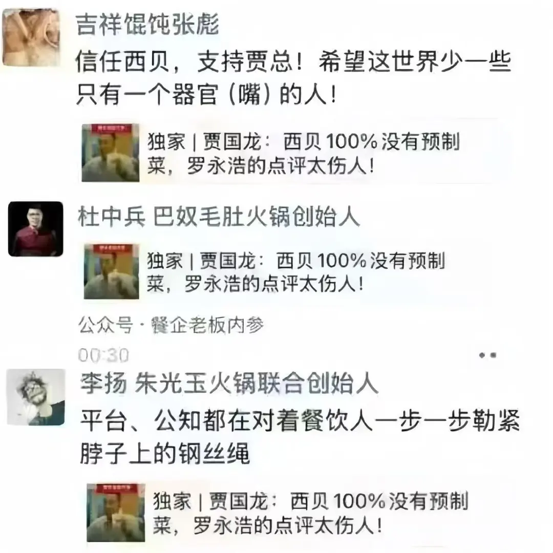 贾国龙的观点代表的绝大多数餐饮老板的心态,9月13日,奴毛肚火锅创始人杜中兵凌晨转载内参文章;吉祥馄饨创始人张彪直言“信任西贝”;朱光玉火锅联合创始人李扬表示“平台公知都在对着餐饮人一步一步勒紧脖子上的钢丝绳”。