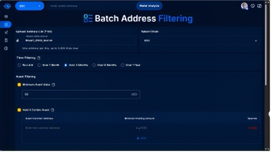 2. 批量地址分析:一次性洞察大规模用户群体 Creditlink 支持用户一次性上传数百上千个钱包地址,并通过自定义条件(如区块链网络、钱包创建时间、余额下限、是否收过空投、是否与特定合约交互等)进行快速筛选。 这对于想要精准锁定真实活跃用户、提升活动命中率、防止女巫攻击的运营团队而言,大幅降低了成本和时间消耗。