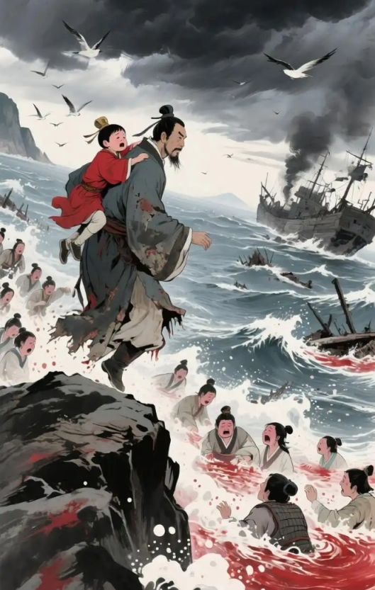 祥兴二年(1279 年)春的崖山,暮色像沉重的幕布笼罩着海面。陆秀夫抱着八岁的宋末帝赵昺,站在 “景炎” 号战船的甲板上,海风卷着咸涩的浪花,打湿了他的官袍。远处,元军的战船如黑云般压来,喊杀声、兵器碰撞声与战船燃烧的噼啪声交织在一起,南宋最后的抵抗正在瓦解。他低头看向怀中熟睡的幼帝,指尖轻轻拂过孩子稚嫩的脸颊,恍惚间回到了十年前的临安 —— 那时他还是国子监的小官,在朝堂上听着文天祥 “法天不息” 的策论,心中满是对大宋江山的期许,从未想过有一天,自己会成为王朝最后的守护者。