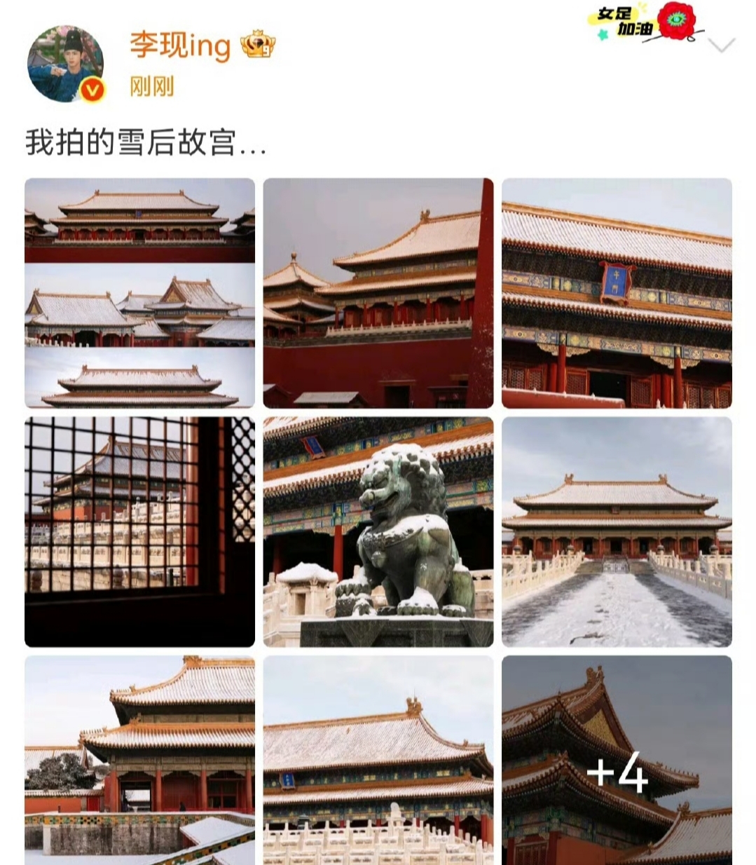 12月14日17时41分,李现微博突然更新。13张故宫雪景大片如画卷展开:午门飞檐挂满冰晶,乾清宫琉璃瓦泛着冷光,角楼倒影在筒子河中碎成粼粼金箔,最惊艳的当属“雪中御猫”——胖橘蹲坐门槛,李现以极低角度拍摄,竟让猫咪拍出了狮子般的威严。这组照片迅速引爆网络,#李现拍的雪后故宫#话题阅读量破3亿,网友盛赞:“构图堪比国家地理,色彩碰撞像莫奈油画!”“原来明星也能拍出壁纸级大片!”