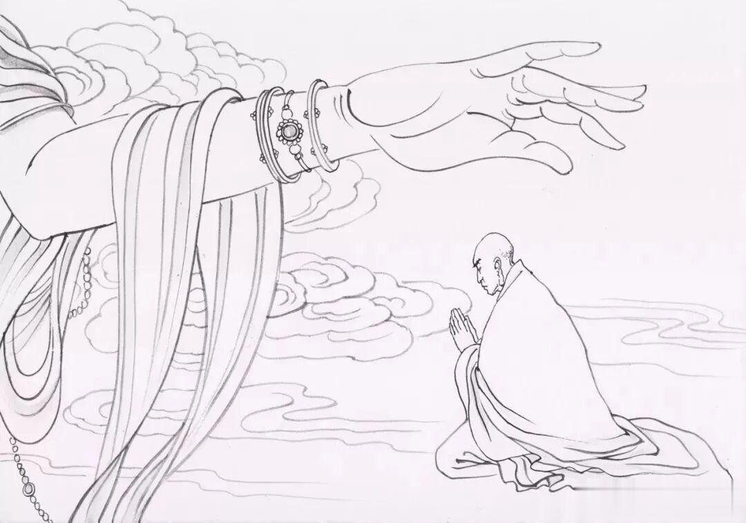 说后,菩萨为大师摩顶,为他授记:“你因念佛,不久当证得无上道果。世间善男子、善女人,如欲快速成就佛道,应当修持念佛法门。”语讫,二位大圣互说偈颂。大师恭敬聆听,法喜充满,作礼而退。