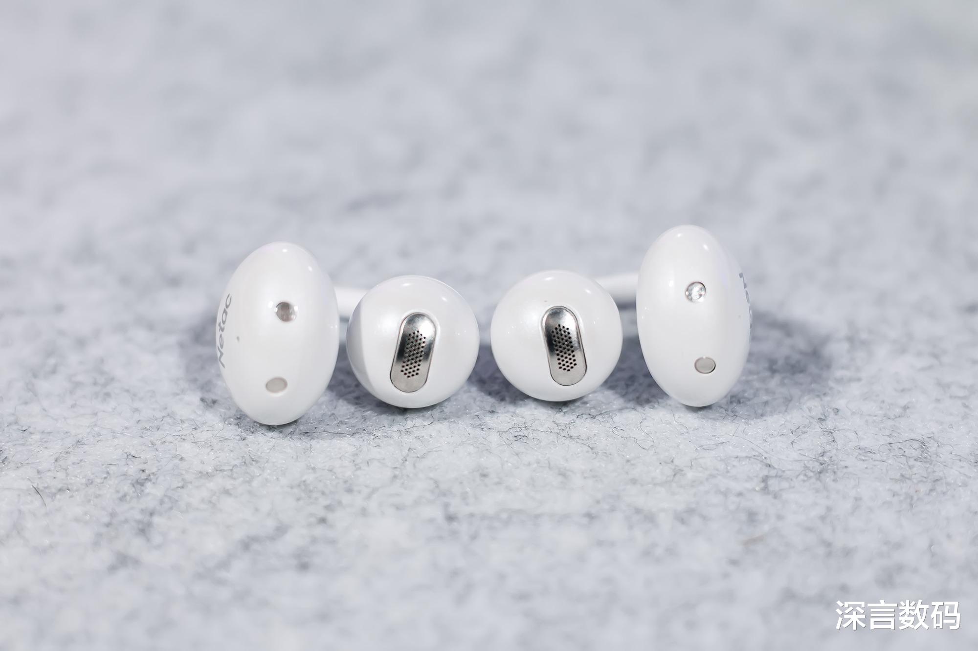 无线耳机的C型桥内嵌高韧性的钛合金材质,外层由软硅胶材质完全包裹,内侧圆形部分为发声腔体,无线耳机采用全新声学腔体设计,内置了12mm大尺寸动圈发声单元,能提供更强的低音效果与更丰富的声音细节,发声孔由金属防尘保护网覆盖。