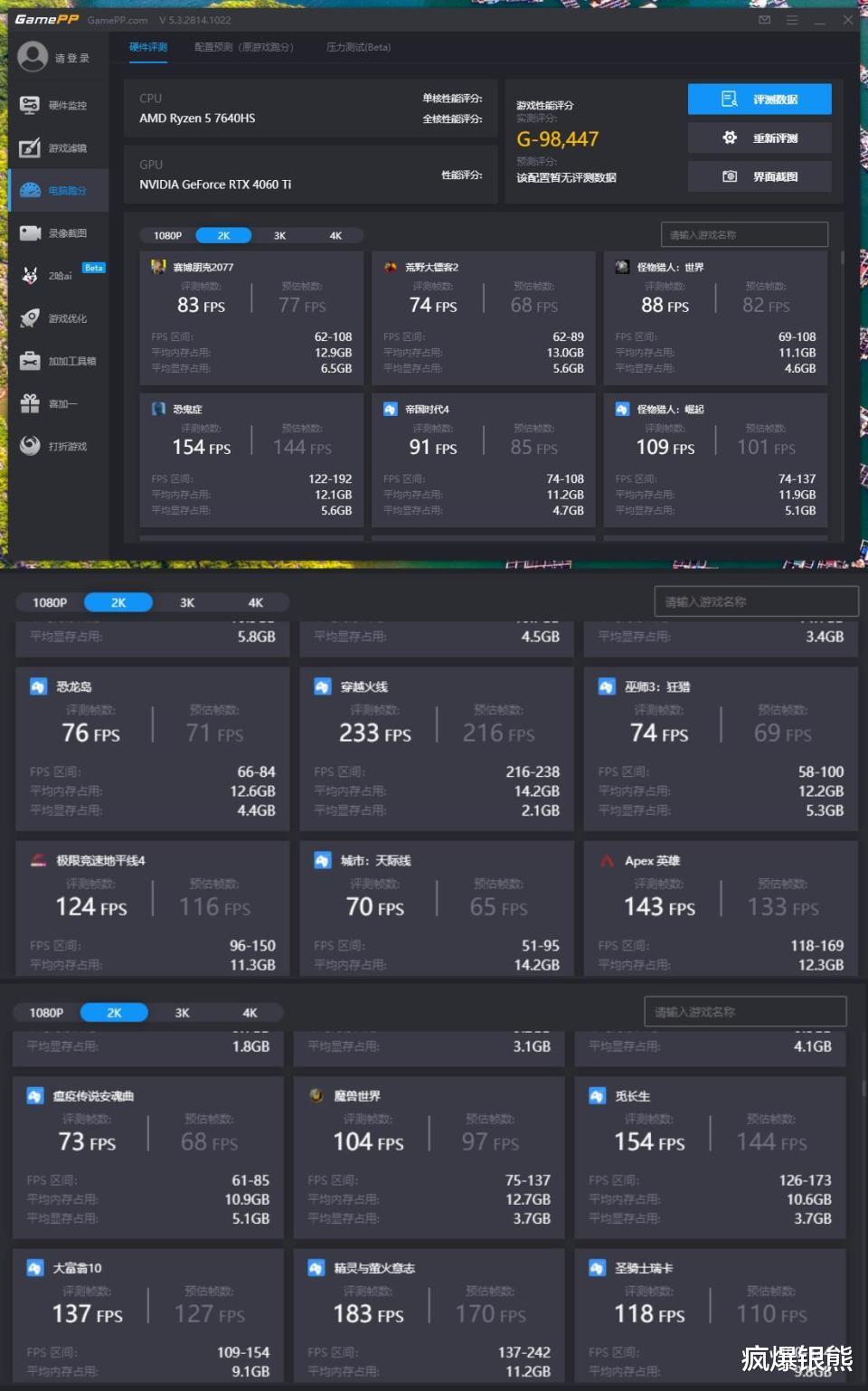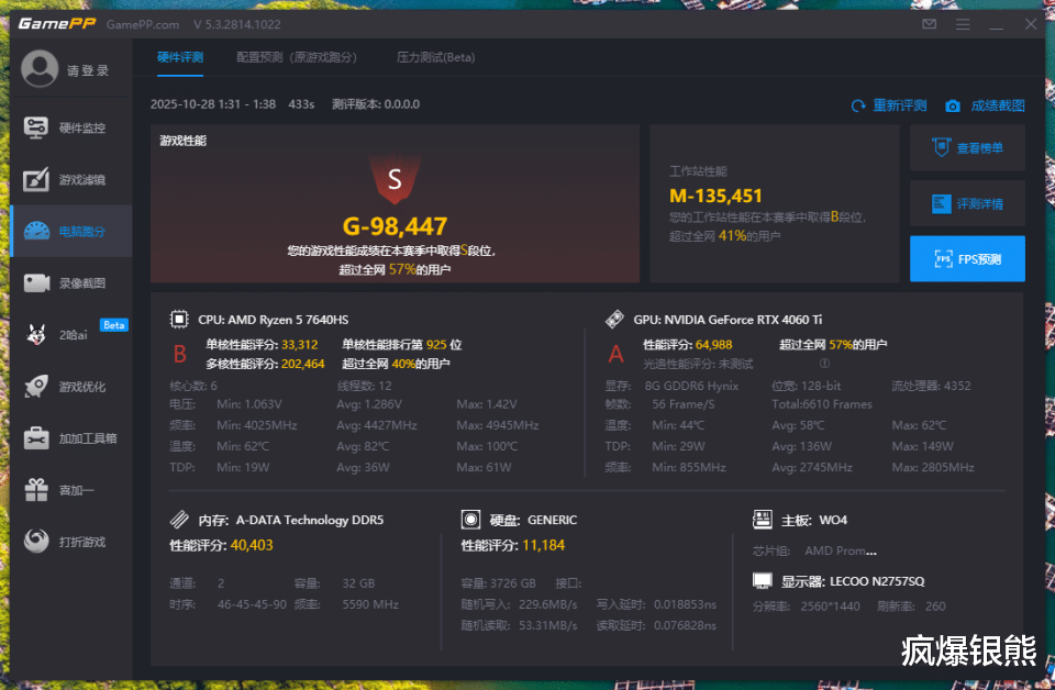 通过Link S-3显卡扩展坞外接英伟达4060ti后gamePP跑分如上图,总分达到了98447,显卡得分从12736提升到了64988。