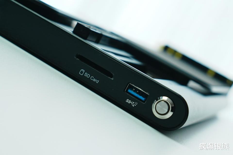 扩展坞另一侧设计的是电源开关键,同时边上还有一个USB-A3.2Gen2接口,一个SD4.0卡槽。