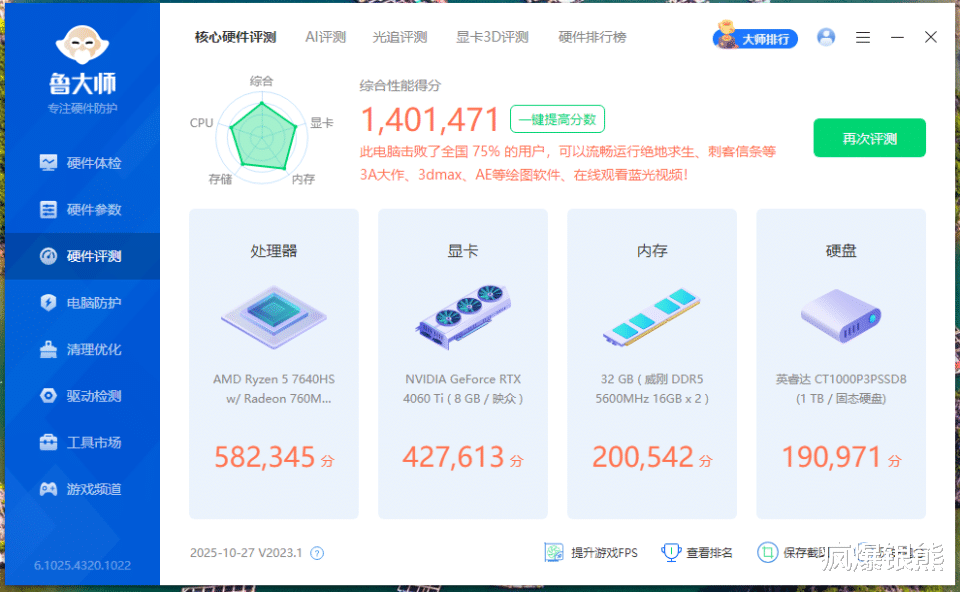 插上显卡扩展坞后,鲁大师跑分如上图,综合得分超140W,其中显卡得分达到了42.7万分,比之前的13万分高了小30万。