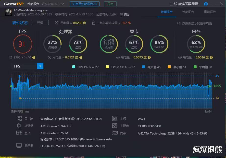 这里问了测试显卡对游戏带来的提升潜力有多大,这里我用国产第一个3A游戏大作《黑神话》做了测试,在不外接显卡情况下,WO4帧率只有30帧不到,而且还是在1080P最低画质开启插帧后的效果,基本属于不可玩的状态。