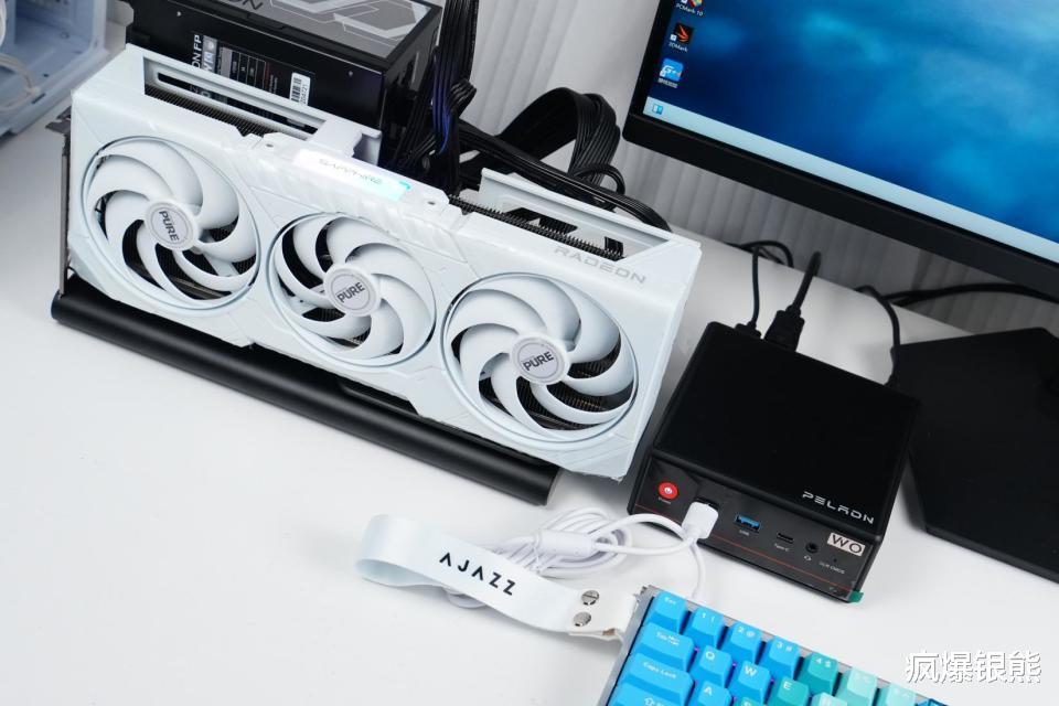 显卡扩展坞虽然不大,但是装上三风扇的显卡也就突出一点点,整机一体性还是蛮好的。不过唯一不足就是电源线和显卡供电线外露需要用扎带绑好。