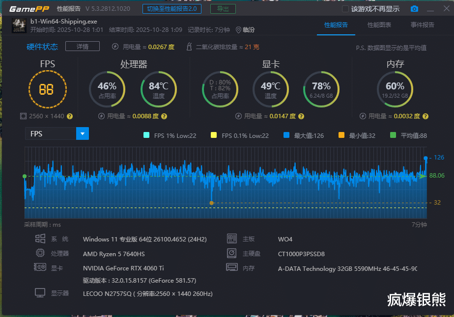 通过Link S-3显卡扩展坞外接4060ti后,在2K分辨率下中等画质,《黑神话》帧率提升明显,从31帧提升到了88帧,翻了一倍还多,这个帧率流畅运行一点毛病没有。另外我也和gamePP预估的帧率做的对比,差距都在个位数以内,所以上面的预估帧率还是挺真实的,可见磐镭WO4迷你电脑+Link S-3显卡扩展坞对于游戏玩家而言也不失是一种弥补显卡不足的好办法。