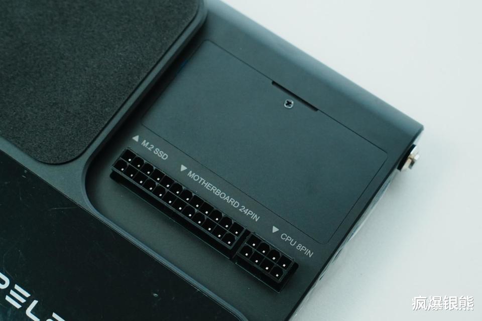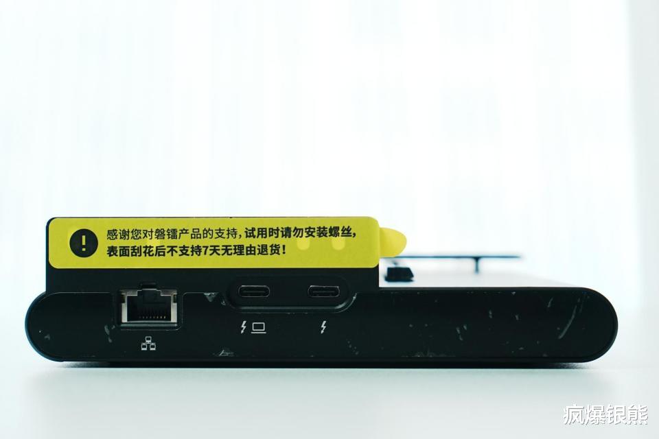 显卡扩展坞侧面是雷电5接口和2.5Ge网口,其中雷电5接口一个负责上行支持140W的PC供电,一个支持下行,支持PD30W供电,同时可输出DP2.1的视频信号。上面黄色贴纸后是电源固定螺孔,电源固定位支持ATX和SFX两种,电源固定的地方也粘贴了防滑减震泡棉,能够有效降低电源风扇引起的震动,蛮贴心的。