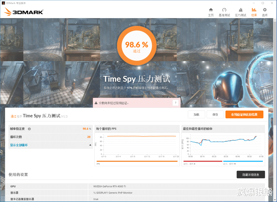 稳定性方面,这里我跑了Time Spy压力测试各20轮,通过率达到了98.6%,算是很稳定的啦。