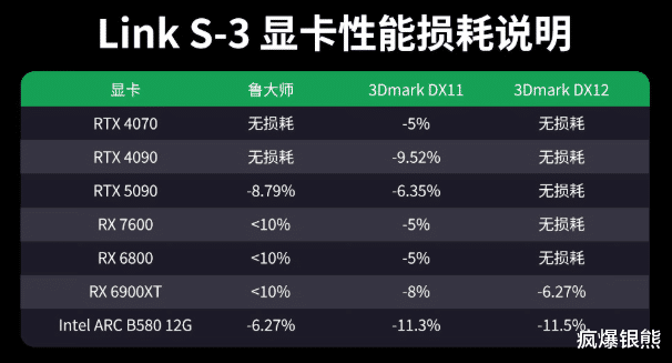 好了,小伙伴,以上就是关于磐镭WO4迷你电脑+Link S-3显卡扩展坞的所有评测内容了。作为中端迷你电脑WO4并不能充分发挥出Link S-3显卡扩展坞的全部潜力,但是就这简单玩一些3A游戏也是没任何问题的。从官方给到的性能损耗说明图可以看出,如果搭配雷电5协议的接口,磐镭的Link S-3即使搭配4090,3Dmark DX11损耗也不足10%,3Dmark DX12甚至是无损耗。