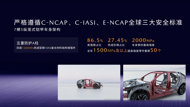 安全是马自达刻在骨子里的DNA。9月,EZ-60在“勇士之路”丙察察成功完成行业首个“整车碰撞/翻滚/浸水”连环挑战,并荣获中汽中心颁发的“TOP Safety”顶级安全证书。EZ-60采用7横5纵的笼式铠甲结构,高强钢占比86.5%,热成形钢27.45%,最高强度2000MPa。A柱采用五重防护结构,内外双层1500MPa热成型钢和腔体SNS复合材料,抗弯性能提升44%。