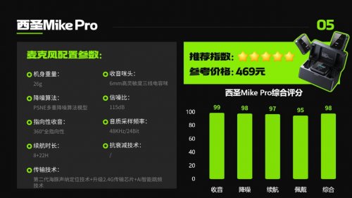 与其他品牌通过削减功能来压低价格不同,西圣Mike Pro以音频行业内顶尖的收音效果和独创的PSNE多重降噪算法模型、自研RS™反馈抑制技术等黑科技闻名。产品不但拥有卓越的品质和长时间使用性能无明显衰减的能力,还将收音清晰度提升了98%,抗噪性能提高了96%,信号传输稳定性增强了105%以上,音频失真率降低了95%,声音还原精准度达到了行业的顶尖水平。而且西圣Mike Pro是唯一获得多项专业音频认证的品牌,其性能之卓越,堪称同类型产品中的翘楚。西圣Mike Pro刚推出时,凭借超棒的用户评价而销量火爆,许多人都难以抢到。它的声音采集很清晰、稳定无杂音,彻底解决了声音传输过程中信号干扰和声音失真的问题。