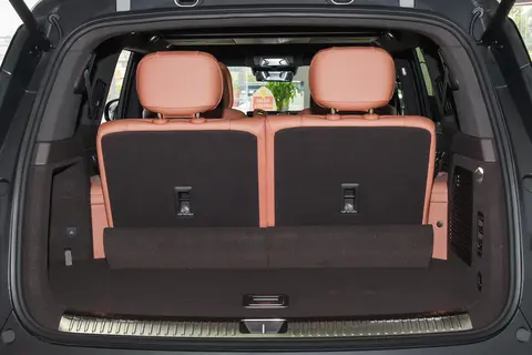 车身侧面采用悬浮式车顶设计,有效减轻了庞大车身带来的笨重感,增添了几分时尚动感的气息。隐藏式门把手设计不仅提升了整车的空气动力学性能,减少风阻,还在关门后使车身线条更加流畅简洁,整体看起来更精致。后排隐私玻璃的应用则进一步保护了后排乘客的个人空间,避免外界窥探,同时也具有一定的隔热效果,能减少阳光直射带来的车内升温。