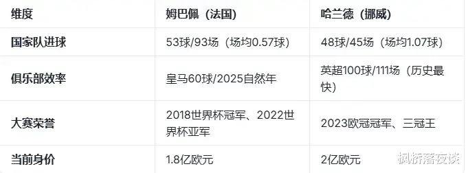 这场价值6亿欧元的对决,本质是两种足球哲学的碰撞:姆巴佩代表着法国足球的冠军传承,他的世界杯决赛帽子戏法仍历历在目;哈兰德则象征着北欧足球的崛起,他用场均1.07球的效率将挪威带入世界杯(自1998年来首次)。正如挪威《晚邮报》评论:"当姆巴佩的绝对速度遇上哈兰德的暴力美学,北美大陆将见证新时代王座的第一次正面交锋。"