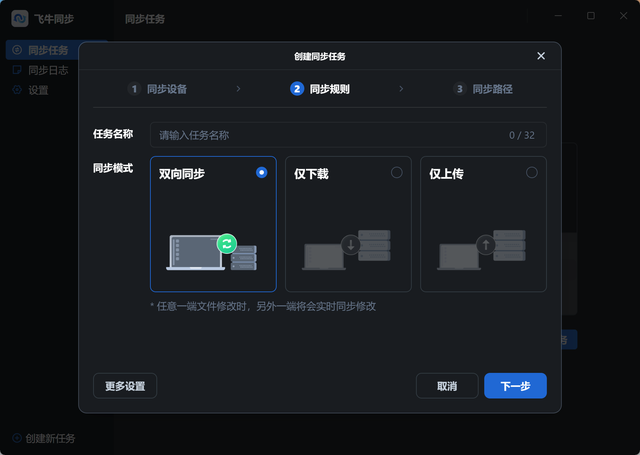 不过目前同步盘功能上线不久,截止发文前版本号才更新至0.1.3,考虑到数据安全性我这里还只是初步尝试。功能部分我选择了常用的双向同步,在电脑上指定同步文件夹,以及 NAS 上的文件夹即可开始使用。