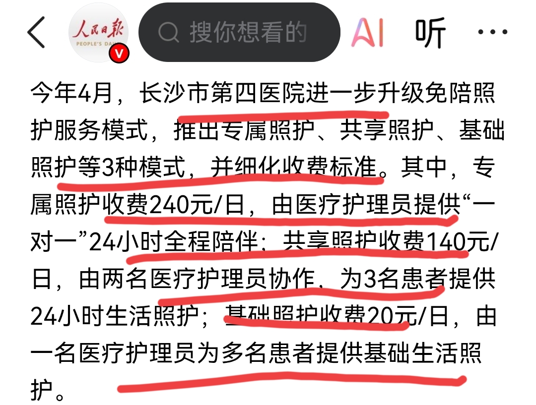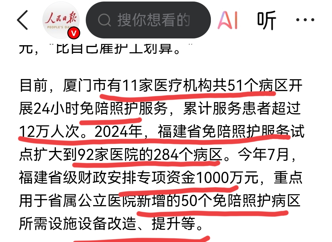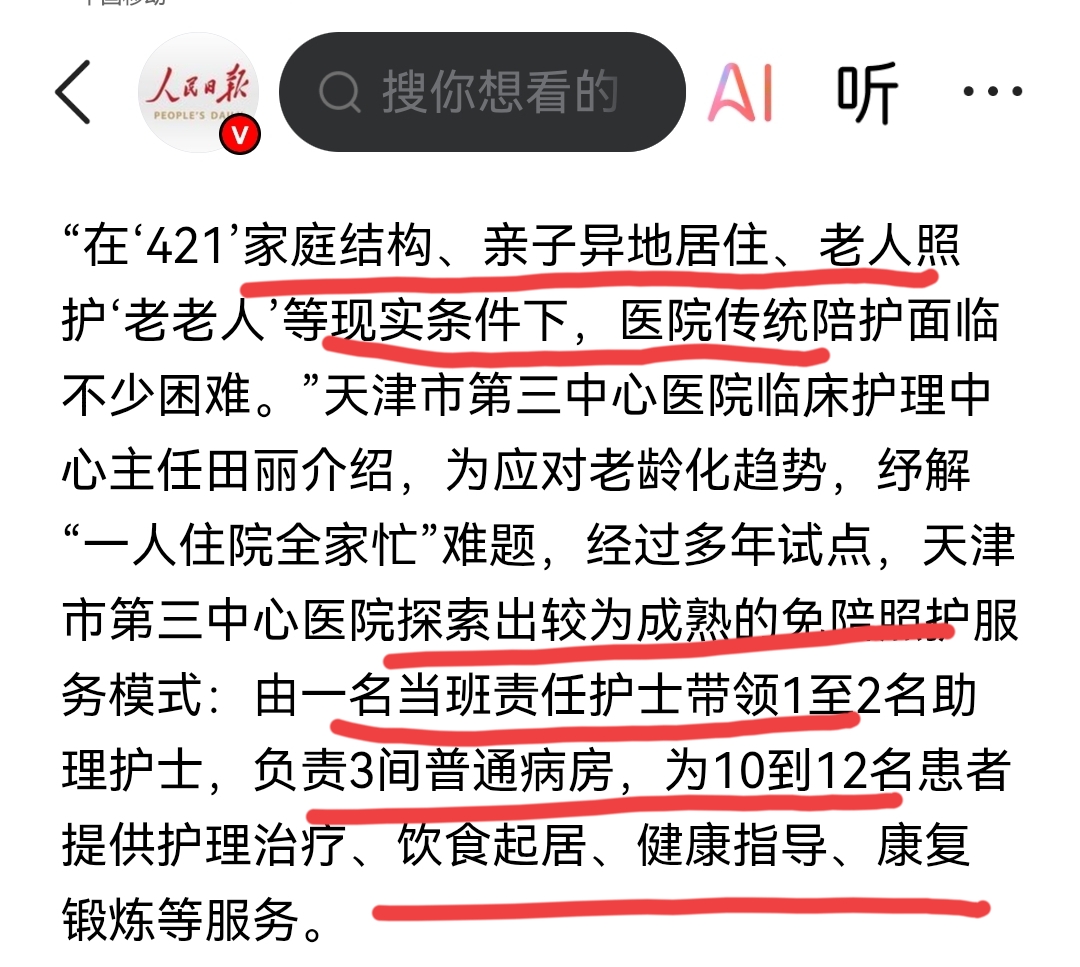 近日,人民日报针对免陪护服务在天津,厦门,湖南等地的医院进行了实地的采访,直接到提供免陪护服务的医院去,采访了医院的工作人员,还有被提供服务的家属还是病人等等,从报道的多起案例来看,几乎选择免陪护服务都是我们前面提到的几类有刚需的家庭。