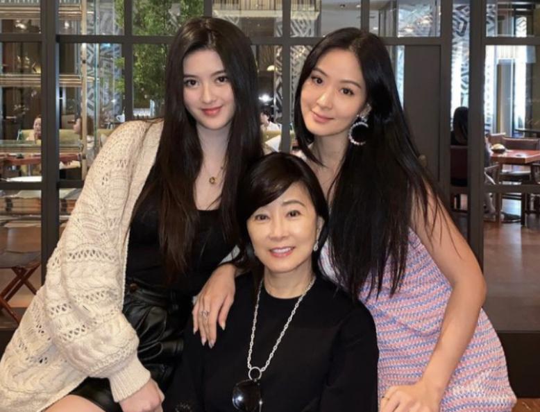 除了后天的锻炼,跟她的基因也不无关系,她的母亲也很显年轻,祖孙三代同框没那么大的年龄差,给人感觉是中年母亲带着两个女儿。