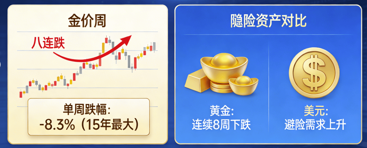全球贵金属市场持续承压,现货黄金价格盘中跌破每盎司4500美元关口,连续八个交易日下跌,创下15年来最大单周跌幅,此前被视为“避险神器”的黄金,在本轮市场波动中出现“失灵”现象,引发市场广泛关注。
