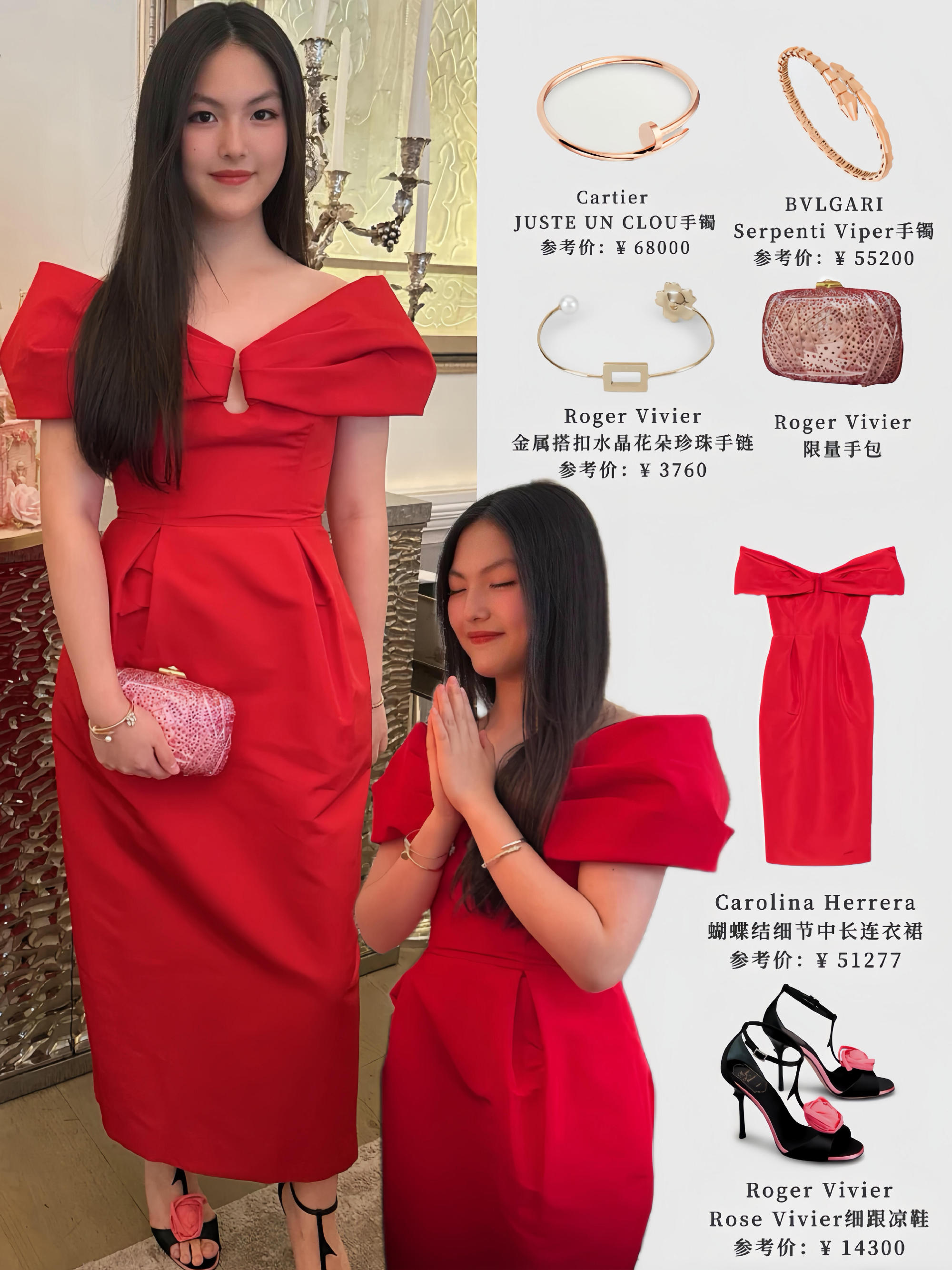 王诗龄身穿一袭红色一字肩礼裙,脚踩黑色高跟鞋,手持芭比粉手拿包,一身喜庆打扮成为全场的焦点。她的这身装扮成熟典雅,让网友不禁感叹当年《爸爸去哪儿》中的小女孩已出落得亭亭玉立。
