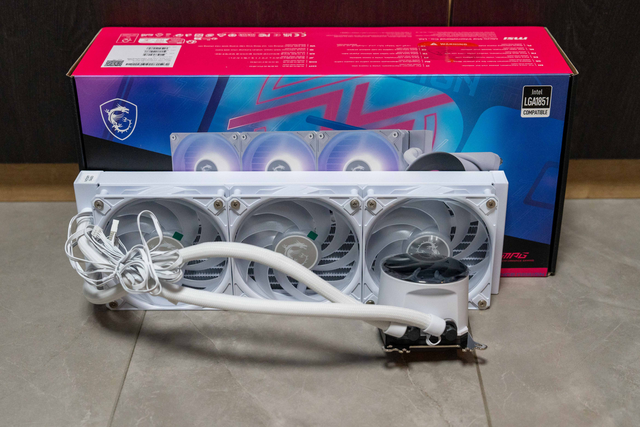 微星 MAG CORELIQUID A15 360 水冷预装的三把 Cyclo Blade 9 环刃积木风扇采用集成线材与专用JAF接口,仅需连接两条线即可完成安装。配合 3400 RPM 高转速陶瓷水泵与 0.1mm微水道全铜底座,能够精准高效地带走核心热量。