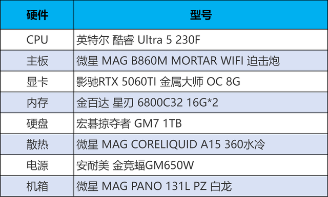专精游戏高性价比:Ultra 5 230F + B860M迫击炮第一套配置的核心思路是在保证2K分辨率下高画质、高帧率游戏体验的同时,将预算效能发挥到极致。
