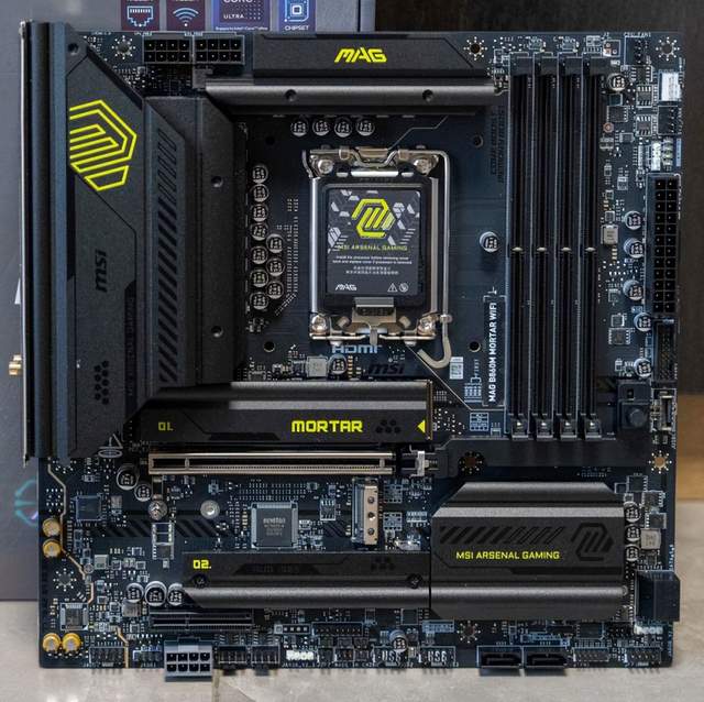 微星 MAG B860M MORTAR WIFI 迫击炮主板以黑色散热装甲为基调,搭配MAG系列特有的绿色涂装,外观硬朗且辨识度极高。其采用经典M-ATX板型,在装机兼容性上表现优异,既能适配紧凑型Mini机箱,也能轻松融入标准ATX机箱,满足多样化装机需求。