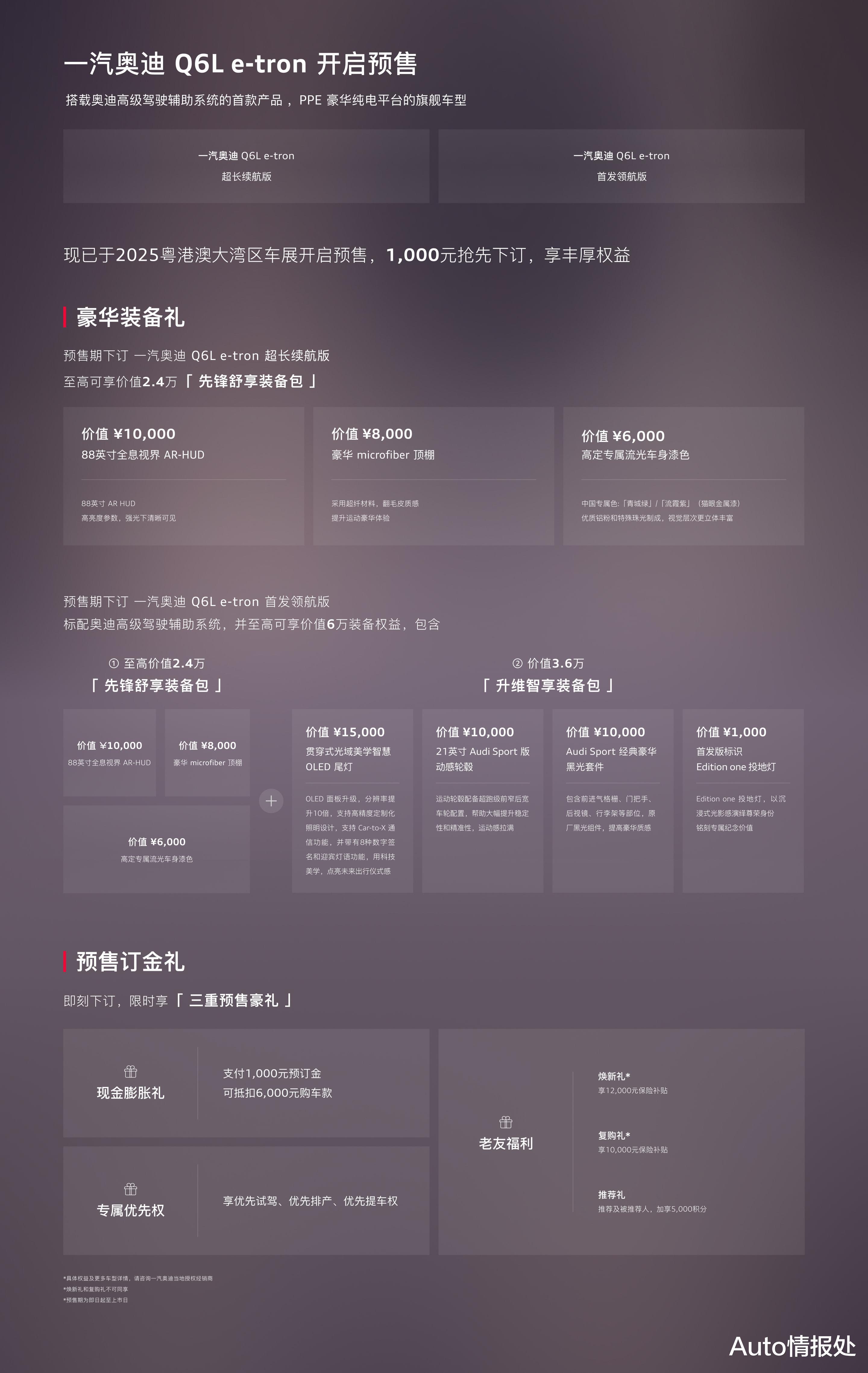 随着新能源车型的快速发展,各家车企也都瞄准了这个市场,相比一些新势力品牌,传统品牌的车型更有保障,如果你的购车预算在30多万元,并且对颜值,品质感,科技感,比较在意的话,我想奥迪Q6L e-tron会是个不错的选择,该车型搭载5防电池,华为乾崑智驾,星辰矩阵大灯,750km+超长续航,预售价格为35.3万元起,那么它都有哪些亮点呢?
