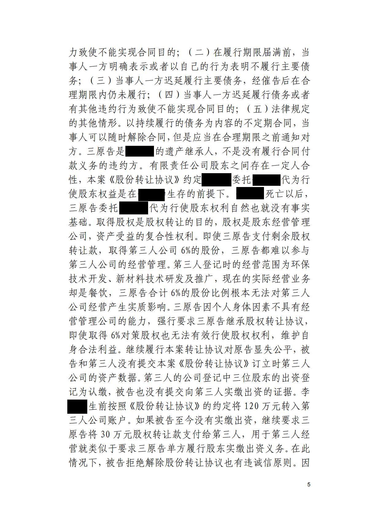 本案源于一份2021年签订的《股份转让协议》。依据协议,已故投资人李女士需支付150万元受让被告持有的公司6%股权。其在支付120万元后不幸去世,尚未完成股权变更登记。李女士的三位法定继承人——年迈多病的父母与无民事行为能力的女儿,既无意愿也无能力继续经营公司,陷入继承股权即需承担后续付款义务的困境,合同目的已无法实现,故诉请解除协议。