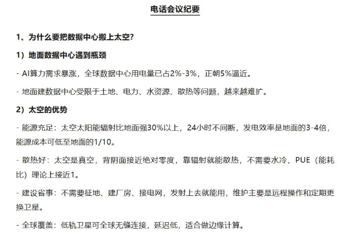 地球上电已经不够了,现在准备在外太空想办法了,看上去逻辑居然很通顺……太阳能比地面强(确实是),24小时不间断(没毛病),发电效率是地球的三倍(当然),成本只有十分之一(不知道),也不用费心冷却了(嗯嗯),也不占地儿(占点大气层)……于是地球上的AI股票跌飞了,特别是美股映射: